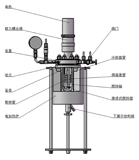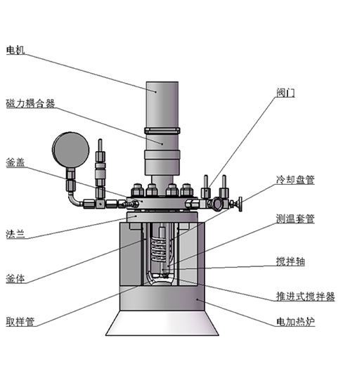 該結(jié)構(gòu)為端面磁力密封裝置,依靠兩塊強力磁鋼異極相吸的原理通過磁場穿透密封罩體來實現(xiàn)力矩的無接觸式傳遞,由于電機直接帶動攪拌器,故而其攪拌特點是低轉(zhuǎn)矩高轉(zhuǎn)速(≤1500r/min),適合攪拌低粘度(cp≤2000mpa.s)或固體顆粒物含量較少的反應(yīng)物料介質(zhì)體系。